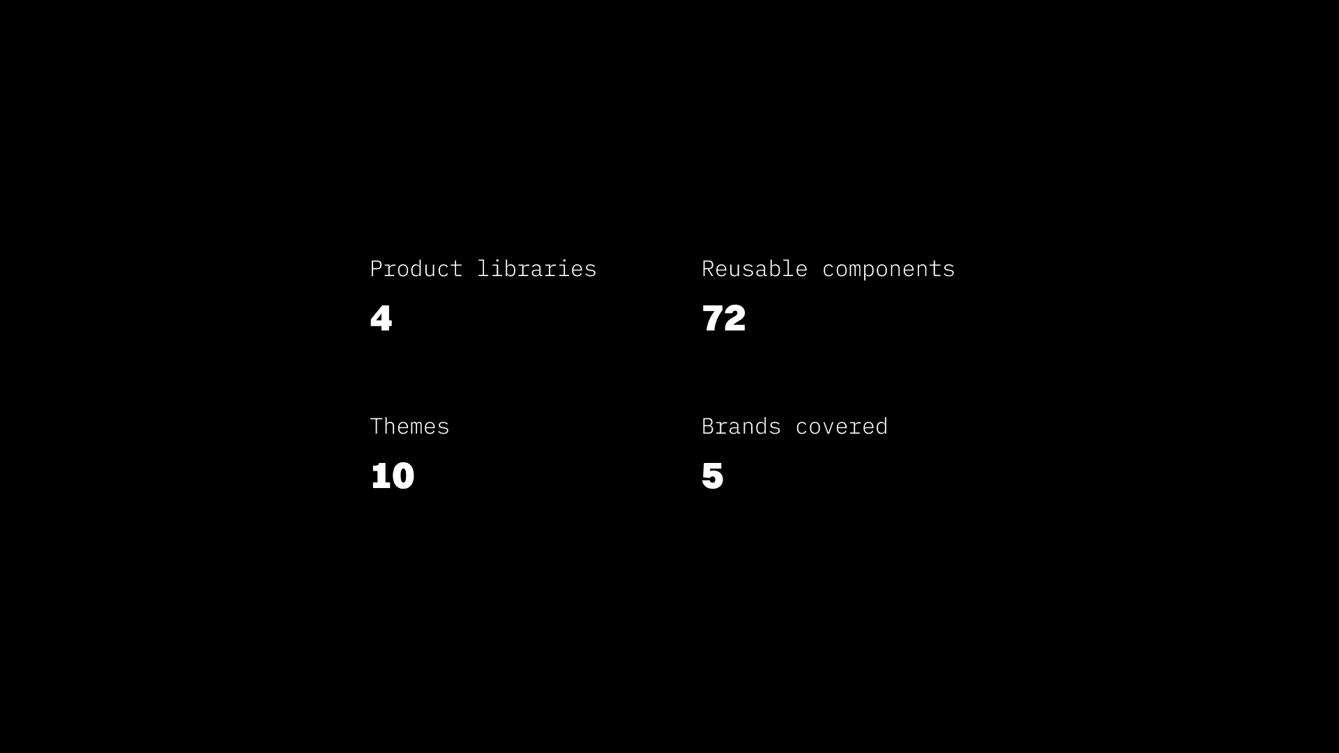 4 libraries shipped with 72 reusable components and a fully functioning token system covering 5 brands.