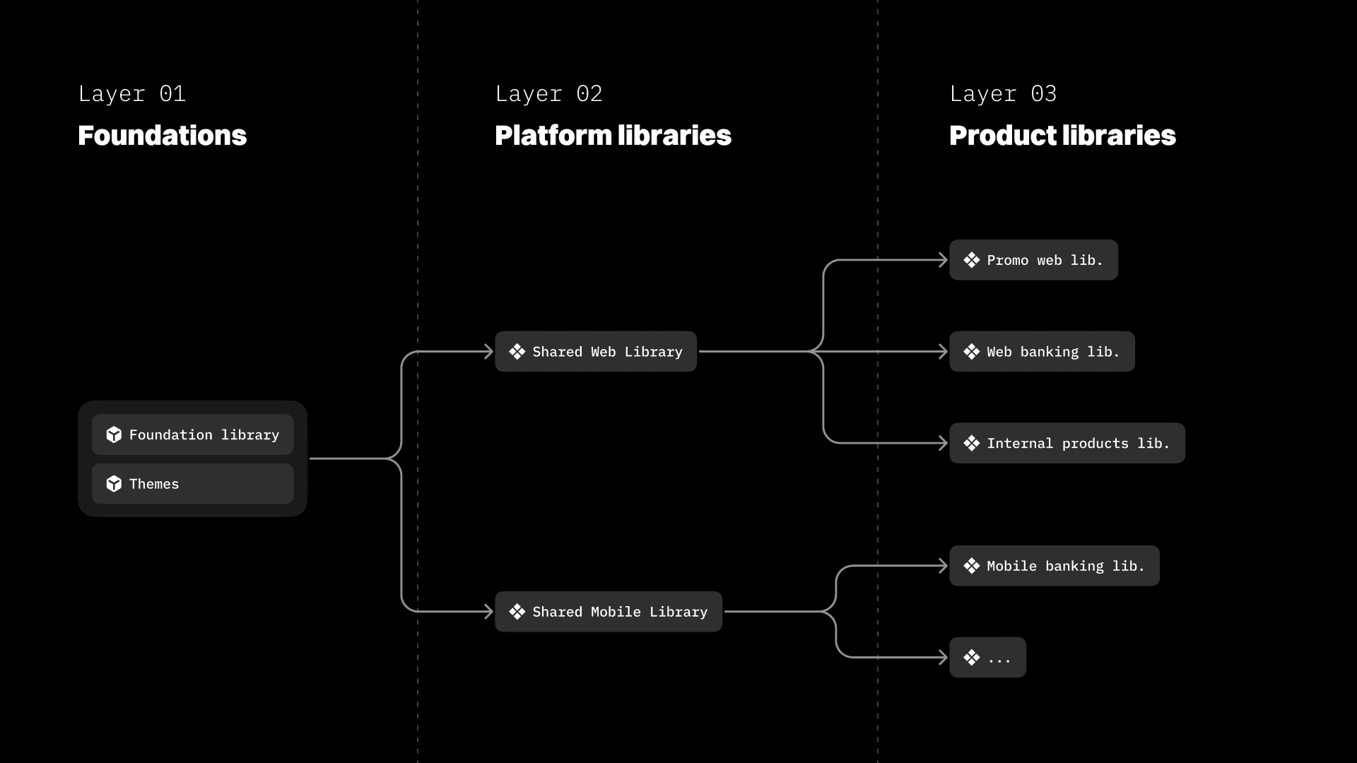 The system was structured as three layers: Foundations housed all primitive elements and a token system supporting 10+ themes across 5 brands. Platform Libraries collected shared components reusable across products on the same platform. Product Libraries were owned and driven by product teams themselves, giving them room to build what they needed without waiting on a central team.