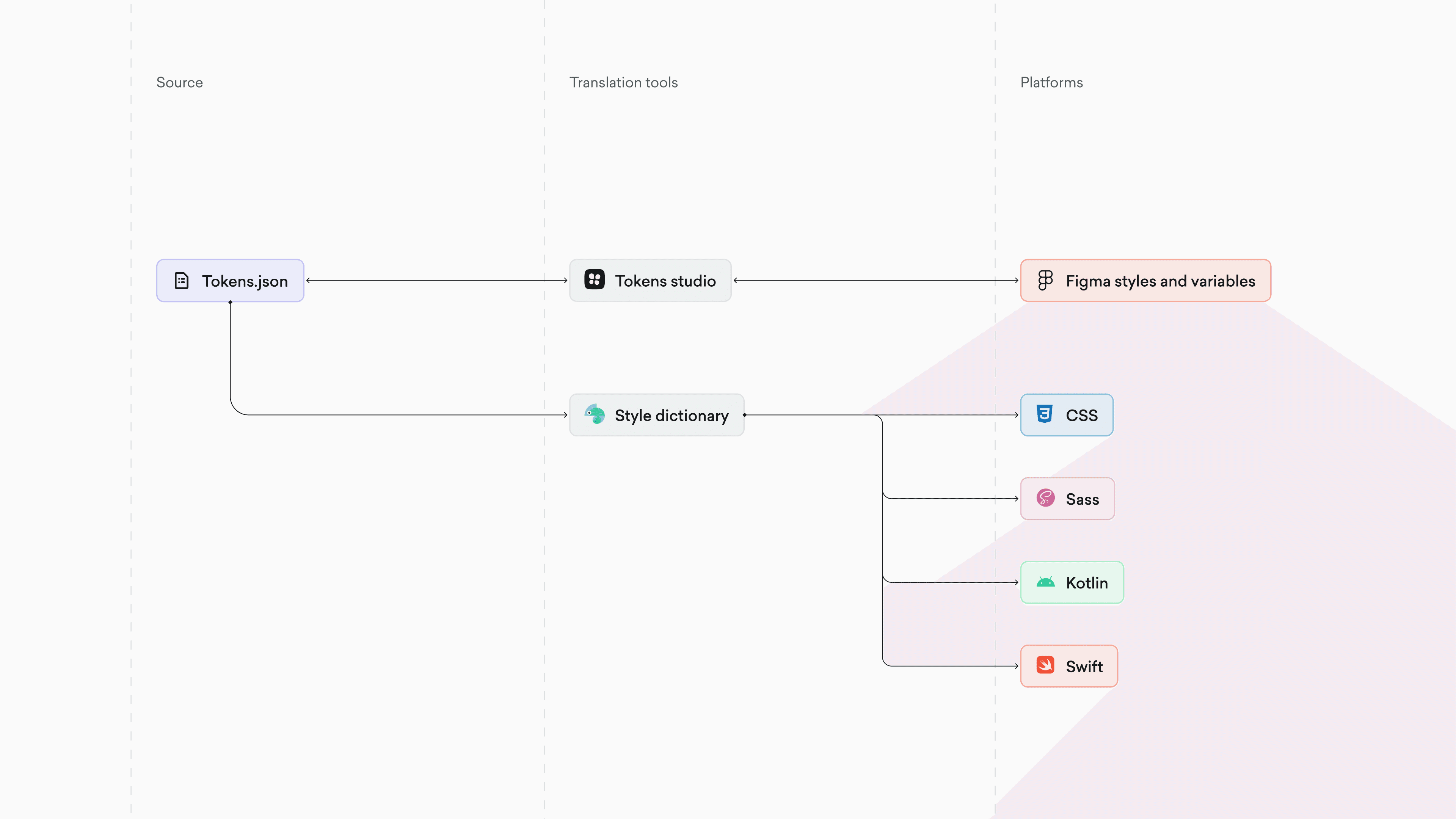 From there, two translation pipelines branched out: Tokens Studio pushed values into Figma as styles and variables, while Style Dictionary compiled the same tokens into platform-specific formats — CSS and Sass for web, Kotlin for Android, and Swift for iOS. One change in the source file would ripple out to every platform automatically.