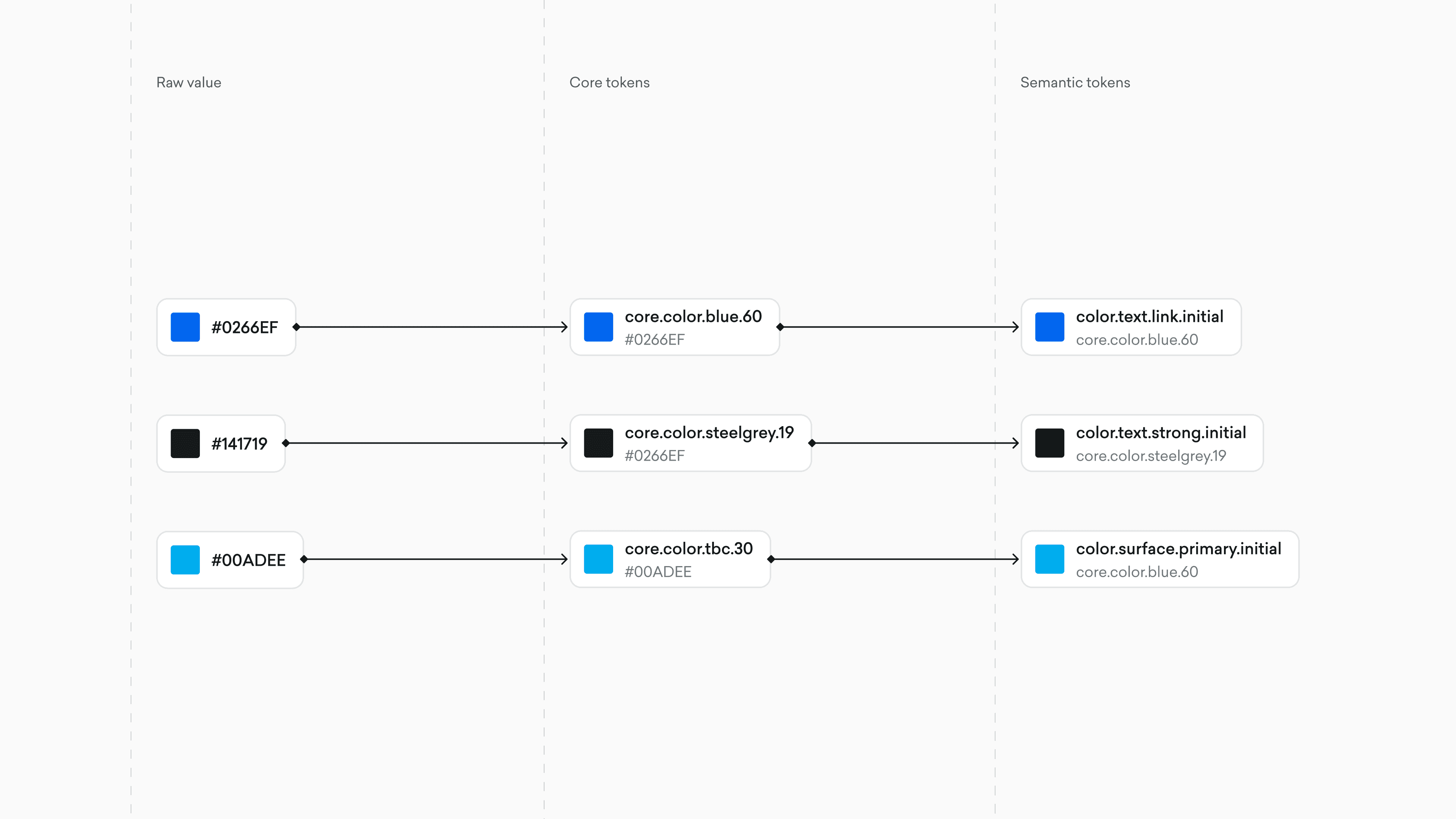 Rather than applying raw color values directly to components, the system introduced two layers: core tokens and semantic tokens. Core tokens mapped raw hex values to named references like core.color.blue.60, while semantic tokens mapped those references to meaningful roles like color.text.link.initial.